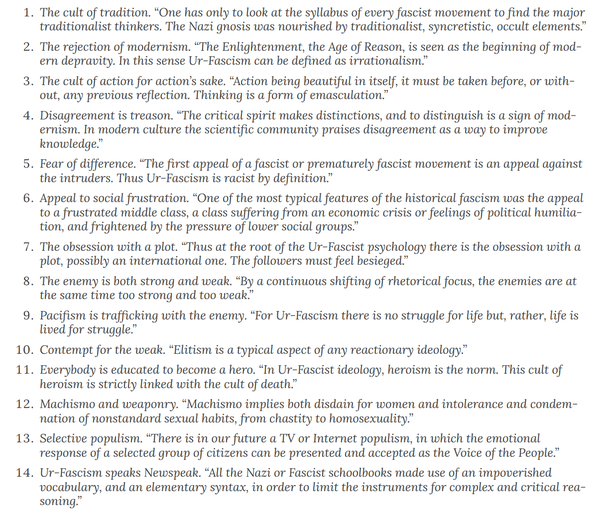 People have studied the nazis, and other fascist regimes, and developed a list of common features of that sort of ideology.