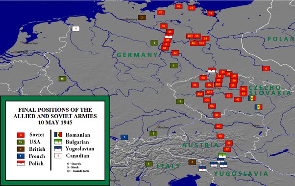 A lot of people talk about the numerical superiority of the Red Army in 1945 as though they are lining up toy soldiers. Yes, there were many, many more Soviet land forces in Europe at the end of the war, but that is only part of the picture. The first consideration is logistics. The second consideration is force multipliers. Let’s start with a picture of where armies were and how numerous they were in May 1945.