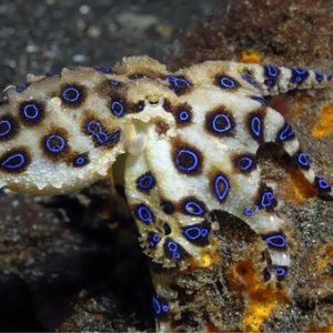 This little guy is called a blue-ringed octopus. Their maximum size is around eight inches – about the size of a golf ball, and they live near coral…