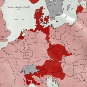 This is a map of Germany at the time of Berlin’s surrender in May 1945. The dark red areas are those still controlled by the German army; they…