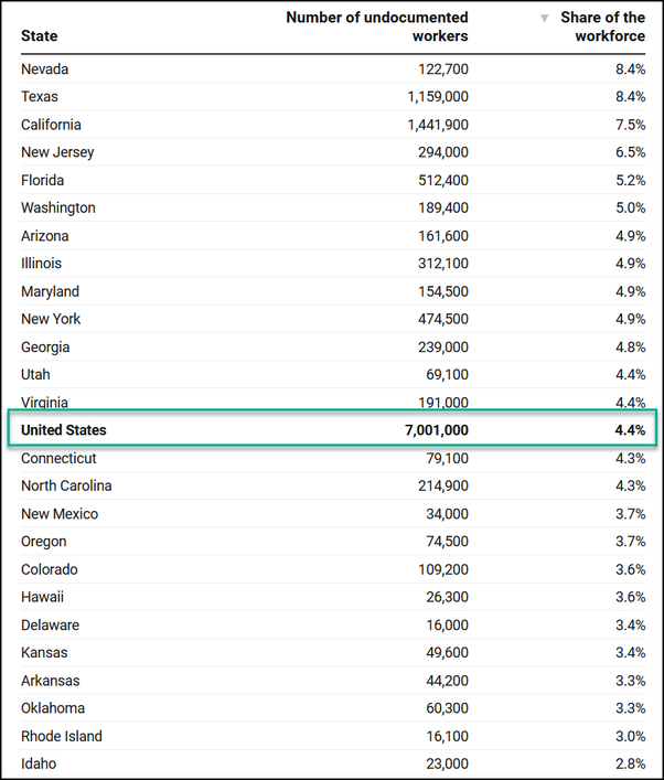 The Center for American progress just released a new study on the employment of undocumented workers in the USA: RELEASE: Millions of Undocumented Immigrants Are Essential to America’s Recovery, New Report Shows. About 4.4% of the employees in the USA are undocumented:
