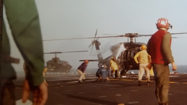 Regardless we needed this Army aircraft off the deck and out of the way so the Marine mechanics on the hanger deck took the blades off. It was amazing how many 12.7mm and small arms rounds it took. The drive shaft to the tail rotor was like swiss cheese and it was still able to get to the Guam, lots of holes in her.